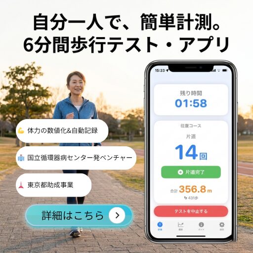 これまで病院の中で多くの6分間歩行テストを行ってきた経験を活かして、医療者が自ら、アプリを作っています。6分間を自動でカウントし、距離の計測も補助するものです。自分で6分間歩行テストを行う事で、ご自身の体力を自分で確認することができるようになります。いつまでも元気に生活することに役立てればと願っています。詳細はこちらのサイトでご確認ください。